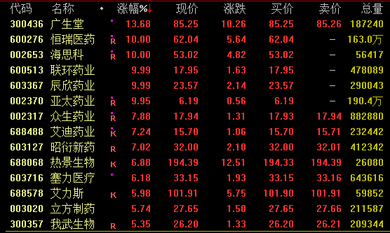 創(chuàng)新藥概念盤中強(qiáng)勢拉升。截至收盤,廣生堂漲近14%,恒瑞醫(yī)藥、海思科、聯(lián)環(huán)藥業(yè)、辰欣藥業(yè)等均漲停。其中,恒瑞醫(yī)藥A股總市值已超4000億元。
