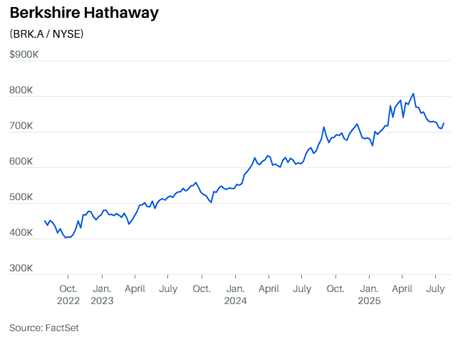 盡管股價(jià)下跌,但估值吸引力開始顯現(xiàn)。伯克希爾A類股目前交易價(jià)約72.5萬美元,相對6月30日賬面價(jià)值46.1萬美元的估值倍數(shù)不到1.6倍,與近年平均水平持平。