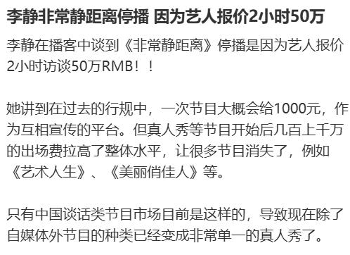 資深主持人兼制作人李靜曾在播客中表示,《非常靜距離》停播的原因之一是,訪談節(jié)目大多以明星為嘉賓,作為主持人,她對采訪對象已失去新鮮感。