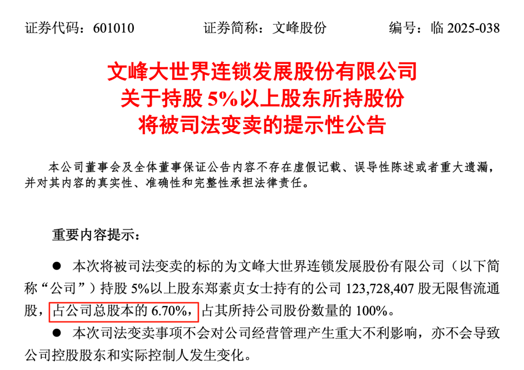 從文峰股份2025年一季報(bào)可知,鄭素貞持有2.75億股文峰股份,是公司第三大股東。4月1日的公告顯示,她持有的這2.75億股股份由山東省青島市中級人民法院在京東網(wǎng)絡(luò)司法拍賣平臺公開拍賣。
