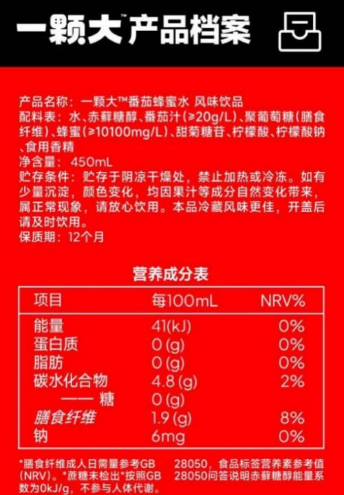 此外,“一顆大”番茄水系列產(chǎn)品的成分也存在問題。產(chǎn)品檔案顯示,番茄汁添加量標注約為“≥20g/L”,這意味著一瓶450ml的番茄水中,實際番茄汁含量不足10g。消費者質疑其“真果汁”和養(yǎng)生價值。