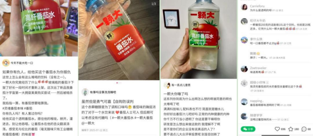 在小紅書等社交平臺上,“一顆大”番茄水因口感和成分被消費者批評。大量消費者吐槽其“難喝”“味道奇怪”“像喝加了代糖的番茄醬水”。在飲品行業(yè),口感是關鍵,這對“一顆大”來說是致命的問題。市場數(shù)據(jù)顯示,番茄汁類飲品在即飲市場的占比僅約0.3%,說明消費者對“把番茄汁當水喝”的接受度還處于初期階段。