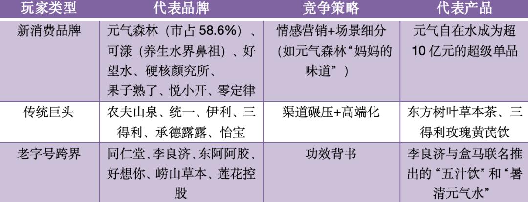 傳統(tǒng)巨頭方面,農(nóng)夫山泉、統(tǒng)一、伊利、三得利等憑借強大的渠道覆蓋能力和品牌影響力強勢進入市場,并積極推動產(chǎn)品高端化。