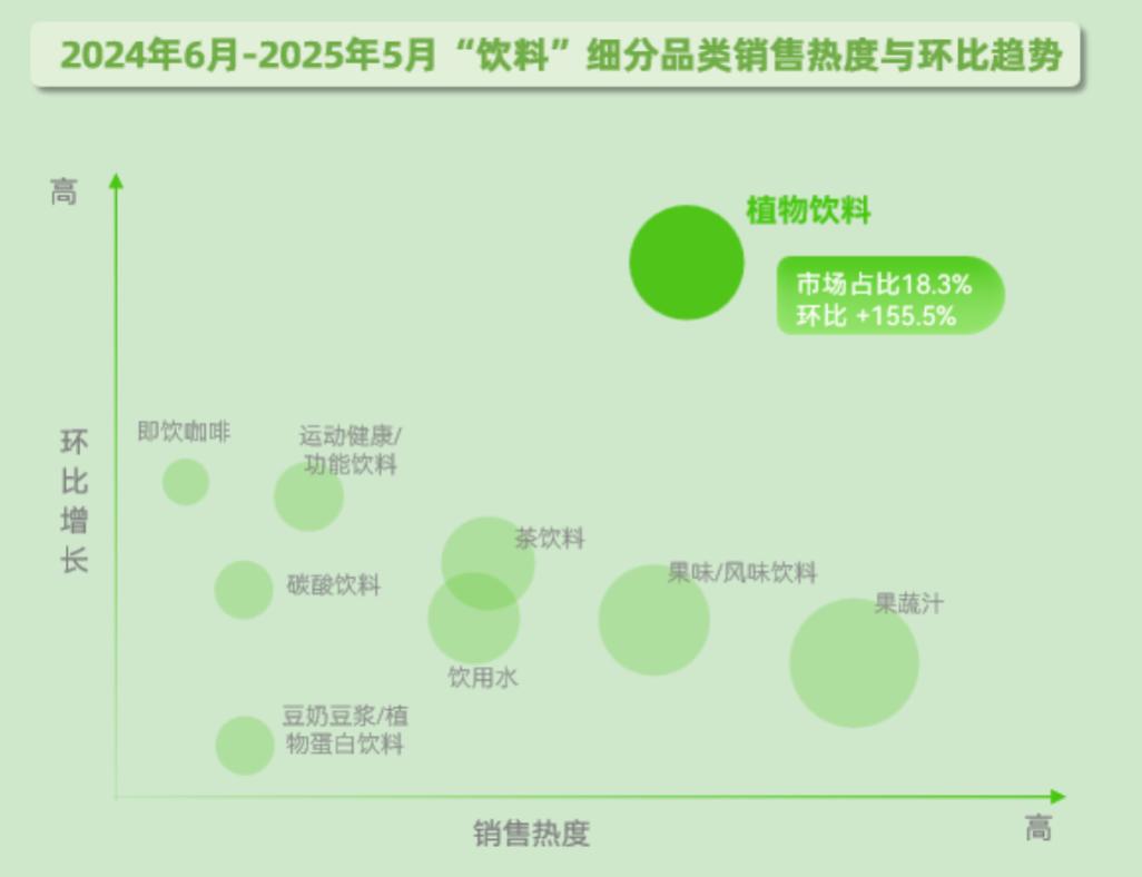 飛瓜數(shù)據(jù)2025年5月的報告顯示,在抖音平臺飲料銷售熱度大于1億的細分品類中,果蔬汁排名第一,植物飲料第二。而且從2023年起,植物飲料的市場重心從傳統(tǒng)的五谷雜糧、枸杞、菊花等,向融入珍稀食材和采用先進工藝的水果化、高維C、高顏值方向轉變。