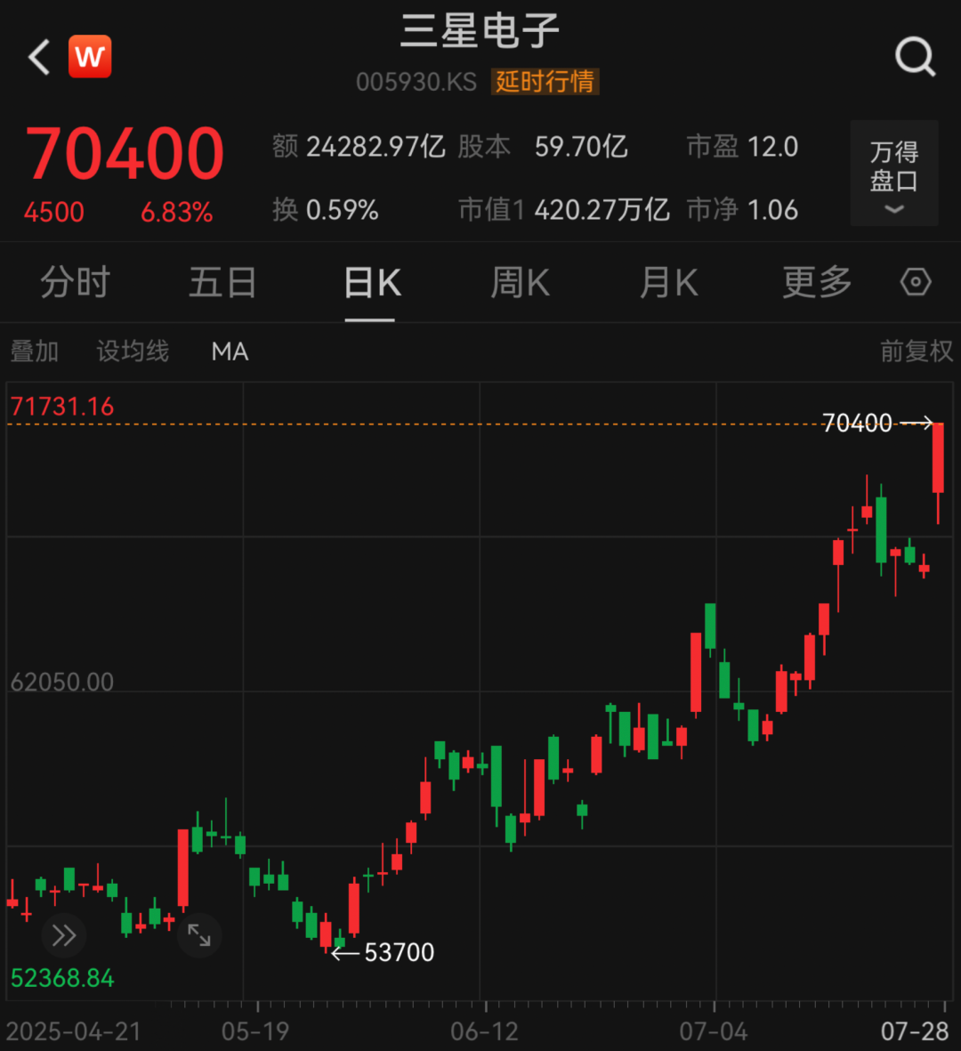 這一消息瞬間引發(fā)全球半導(dǎo)體行業(yè)的高度關(guān)注。受此影響,三星電子股價直線拉升,截至韓股收盤,漲幅達(dá)6.83%,報70400韓元/股,為去年9月以來最高水平。這一表現(xiàn)直接帶動韓國股市走強(qiáng),韓國綜合指數(shù)收漲0.42%。