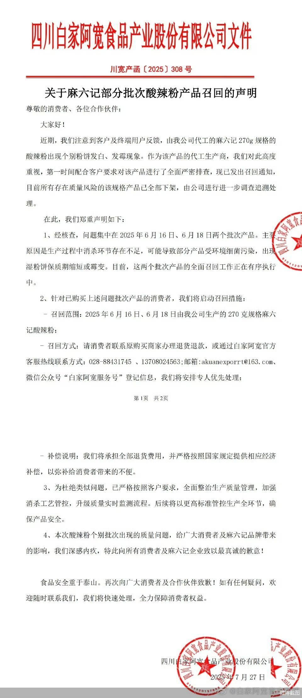 7月28日,四川白家阿寬食品產(chǎn)業(yè)股份有限公司(以下簡(jiǎn)稱“阿寬食品”)發(fā)布關(guān)于麻六記部分批次酸辣粉產(chǎn)品召回的聲明。其中顯示,阿寬食品注意到客戶及終端用戶反饋,由公司代工的麻六記270克規(guī)格的酸辣粉出現(xiàn)個(gè)別粉餅發(fā)白、發(fā)霉現(xiàn)象,現(xiàn)已發(fā)出召回通知,目前所有存在質(zhì)量風(fēng)險(xiǎn)的該規(guī)格產(chǎn)品已全部下架,由公司進(jìn)行進(jìn)一步調(diào)查追溯處理。