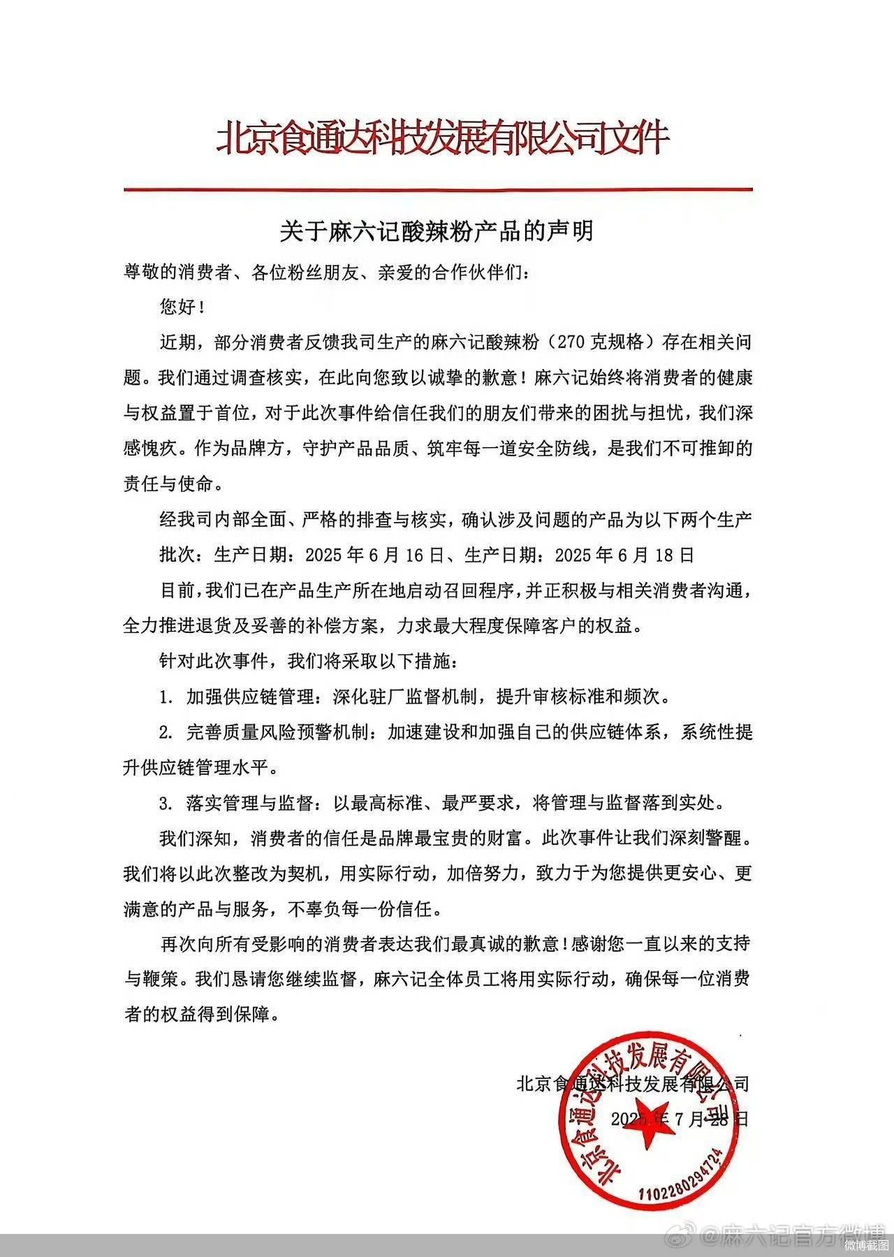 針對(duì)已購(gòu)買上述問題批次產(chǎn)品的消費(fèi)者,阿寬食品將啟動(dòng)召回措施,召回范圍包括2025年6月16日、6月18日由阿寬食品公司生產(chǎn)的270克規(guī)格麻六記酸辣粉,請(qǐng)消費(fèi)者聯(lián)系原購(gòu)買商家辦理退貨退款,或通過白家阿寬官方登記信息。阿寬食品稱將承擔(dān)全部退貨費(fèi)用,并嚴(yán)格按照國(guó)家規(guī)定提供相應(yīng)經(jīng)濟(jì)補(bǔ)償,以彌補(bǔ)給消費(fèi)者帶來的不便。