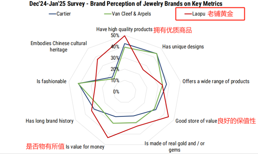 黃金也不再是一種具有保值屬性的金屬,而是成功升維為承載中國文化的珍貴載體,展現(xiàn)出經(jīng)典、傳世且極具中式高級(jí)審美的品牌調(diào)性。消費(fèi)者樂于在日常中佩戴,而非閑置于保險(xiǎn)柜中,分享自己的品質(zhì)追求和審美品味。大摩研報(bào)指出2025年老鋪黃金在社交媒體的搜索量加速增長(zhǎng),在社交媒體上,曬“佩戴老鋪黃金”已經(jīng)成為一種時(shí)尚和社交話題的流量密碼。