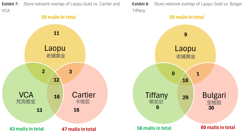 在高端商場(chǎng)布局上,老鋪黃金門店全部位于一線和新一線城市的頭部商業(yè)中心。摩根士丹利研究表明,其門店網(wǎng)絡(luò)與卡地亞、梵克雅寶等品牌高度重疊,比如約32%的卡地亞中國門店與老鋪直接競(jìng)爭(zhēng),而同場(chǎng)競(jìng)技的結(jié)果是,老鋪黃金在2024年的單個(gè)商場(chǎng)平均收入超越了所有國際珠寶品牌;2025年,單個(gè)商場(chǎng)的平均收入更是接近5億,甚至超越了部分國際一線奢侈品牌。