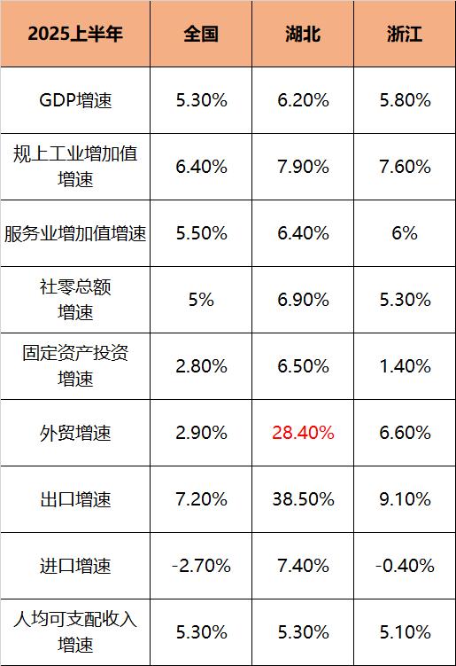 從GDP、工業(yè)、服務(wù)業(yè)、消費(fèi)、投資、外貿(mào)、人均收入等指標(biāo)增速來看,湖北均大幅跑贏全國平均增速,尤其是外貿(mào)、固投、工業(yè)這幾個(gè)重要指標(biāo)。浙江除了固定資產(chǎn)投資、人均收入等增速,其他指標(biāo)均跑贏全國平均增速。