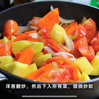 2、準備配菜,把洋蔥、胡蘿卜、土豆、西紅柿切成塊。先將洋蔥下鍋炒香,接著放入所有配菜,稍微炒軟,撒上黑胡椒鹽調(diào)味。