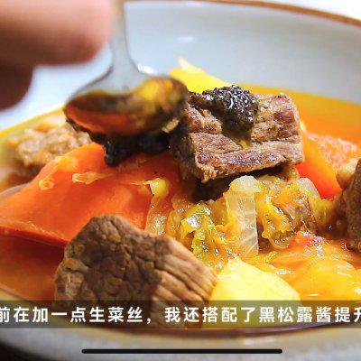 慢燉牛肉與番茄相互融合,酸甜口感中彌漫著醇厚肉香。搭配黑松露醬后,獨特菌香與胡蘿卜的清甜、土豆的綿密交織,帶來美妙滋味。