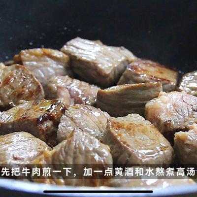 1、將新鮮牛肉切塊后煎一下,加入一點黃酒和水熬煮高湯,可添加一些香料,如桂皮、香葉、百里香等。