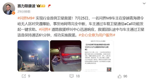 快科技7月29日消息,據(jù)中國電信衛(wèi)星公眾號介紹,7月25日,一位問界M9車主在穿越青海德令哈無人區(qū)時,車輛突然爆胎無法繼續(xù)行駛,而且手機、車機均無蜂窩信號。