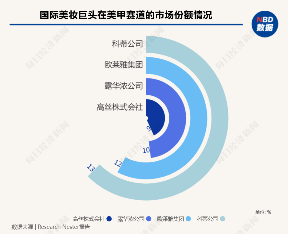 隨著市場(chǎng)潛力凸顯,不僅個(gè)體門店,越來(lái)越多品牌和資本也加入美甲賽道的爭(zhēng)奪中。目前,美甲市場(chǎng)競(jìng)爭(zhēng)激烈且高度分散,眾多跨國(guó)集團(tuán)占據(jù)著市場(chǎng)頂端的位置,科蒂、歐萊雅、露華濃、高絲、愛(ài)茉莉等國(guó)際美妝品牌均已布局美甲相關(guān)業(yè)務(wù)。其中,科蒂公司占據(jù)最大的美甲市場(chǎng)份額,約為13%;其次是歐萊雅集團(tuán),份額約為12%;露華濃公司和高絲株式會(huì)社的份額分別為10%和9%。