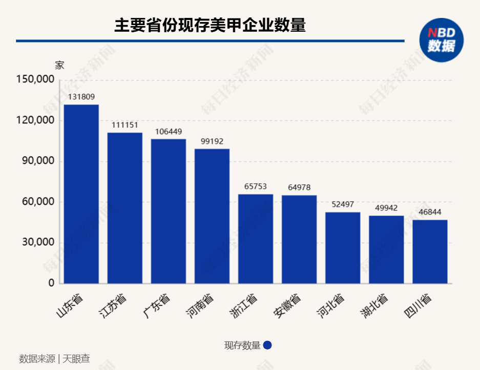 從行業(yè)整體規(guī)模來(lái)看,《每日經(jīng)濟(jì)新聞》記者從天眼查獲取的數(shù)據(jù)顯示:現(xiàn)存美甲企業(yè)中,注冊(cè)資本在100萬(wàn)元以下的占比90%,500萬(wàn)元以上的僅占1.61%。山東省、江蘇省和廣東省是“美甲大省”,分別有13.2萬(wàn)家、11.1萬(wàn)家和10.6萬(wàn)家美甲公司,河南省、浙江省、安徽省、河北省、湖北省和四川省的美甲公司均在4萬(wàn) - 10萬(wàn)家之間。