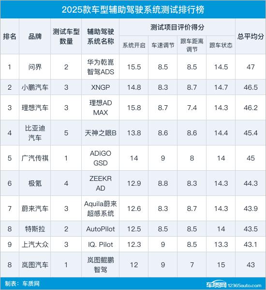2025款車型輔助駕駛系統(tǒng)測試排名揭曉