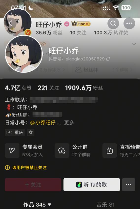 此外,旺仔小喬的抖音賬號也被禁止關(guān)注。