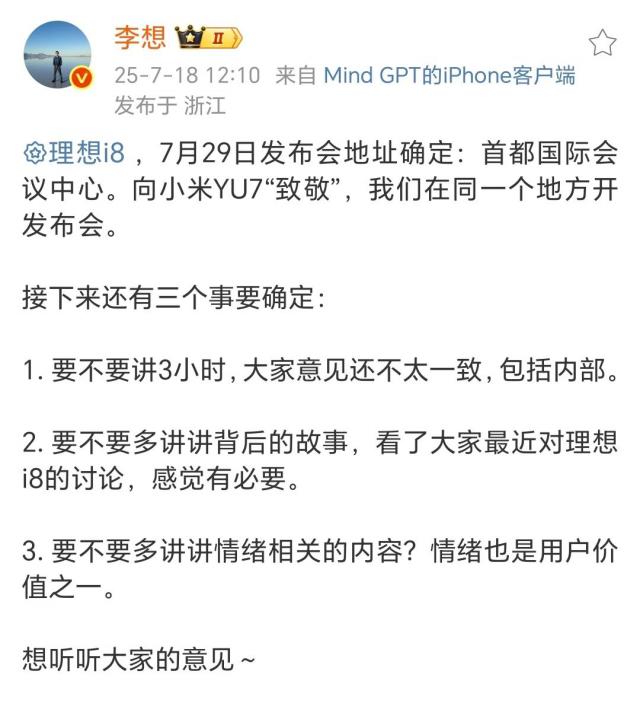 新勢力在“借鑒”方面毫不避諱。李想近日明確表示,將i8上市地點選在了首都國際會議中心,這正是小米YU7開發(fā)布會的場地,直接表達了“致敬”之意。