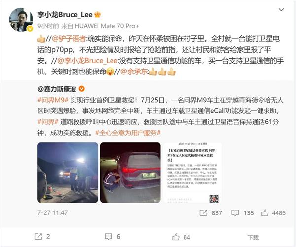 快科技7月29日消息,有網(wǎng)友給華為Mate之父李小龍留言,稱衛(wèi)星通信手機(jī)真的能保命。該網(wǎng)友因暴雨被困村子,全村只有一臺(tái)華為Pura 70 Pro+能打衛(wèi)星電話。這臺(tái)手機(jī)不僅及時(shí)將險(xiǎn)情報(bào)告給搶險(xiǎn)前指,還讓村民和游客給家里報(bào)了平安。