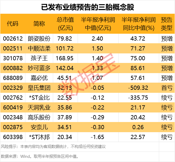 證券時報·數(shù)據(jù)寶梳理了截至7月28日已發(fā)布上半年業(yè)績預(yù)告的三胎概念股,共11只。其中,朗姿股份、中順潔柔、孩子王、妙可藍(lán)多、嘉必優(yōu)預(yù)計上半年實現(xiàn)盈利,歸母凈利潤中值分別為2.4億元、1.5億元、1.4億元、1.33億元、1.07億元。