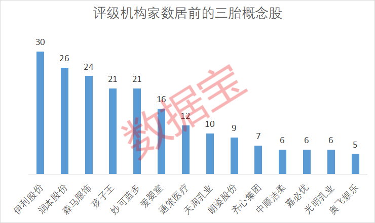從機(jī)構(gòu)關(guān)注度來看,伊利股份、潤本股份、森馬服飾、孩子王、妙可藍(lán)多排名前五,評級機(jī)構(gòu)家數(shù)分別為30家、26家、24家、21家、21家。