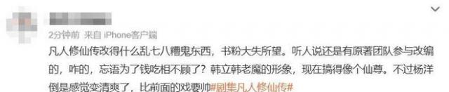 還有網友稱,《凡人修仙傳》改編得亂七八糟,書粉大失所望。據說有原著團隊參與改編,但韓立韓老魔的形象卻變得像仙尊,不過楊洋倒是變得清爽了。
