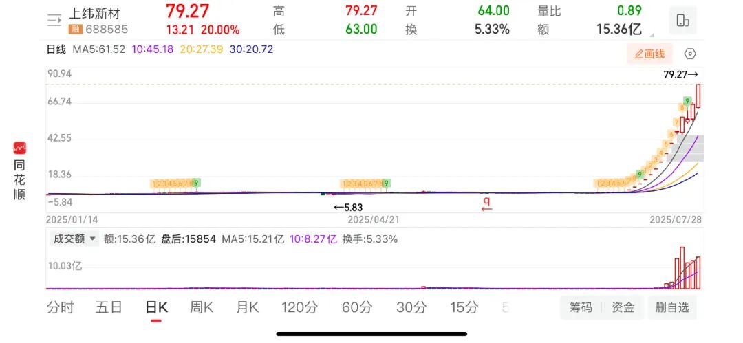 造機器人哪有造上市公司賺錢快!北京時間7月28日,A股上市公司上緯新材(688585.SH)尾盤封板,大漲20%,收盤價達79.27元,成為2025年A股首個十倍股。14個交易日前,上緯新材停牌前的收盤價為7.78元,2024年最后一個交易日12月27日收盤價為6.78元。不管是按2024年收盤價,還是按停牌前收盤價計算,上緯新材都是2025年的第一個十倍股。