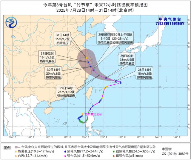 今年第8號臺風(fēng)“竹節(jié)草”(熱帶風(fēng)暴級),29日5時其中心位于距離浙江省舟山市東南方向約425公里的洋面上,具體位置是北緯27.3度、東經(jīng)125.3度,中心附近最大風(fēng)力達(dá)8級(18米/秒),中心最低氣壓為992百帕。