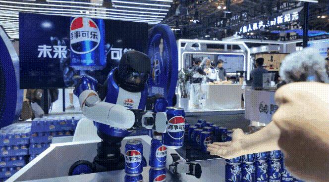 智元機器人穿著涂裝在現(xiàn)場發(fā)可樂,能精準(zhǔn)捕捉伸手的位置。不過人類總愛“搗亂”。
