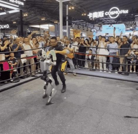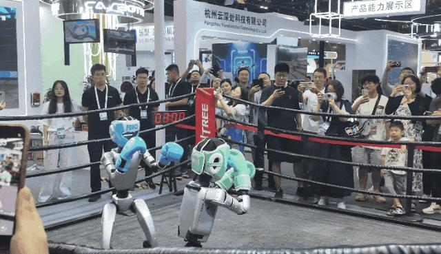 藝術(shù)表演看完,還有體育展示。宇樹在現(xiàn)場搭了拳擊舞臺,先是機器人對打,難分勝負(fù),后來還有機器人和人類對打,感覺機器人有點“欺負(fù)”人類??磥頇C器人在武打方面還得提升。