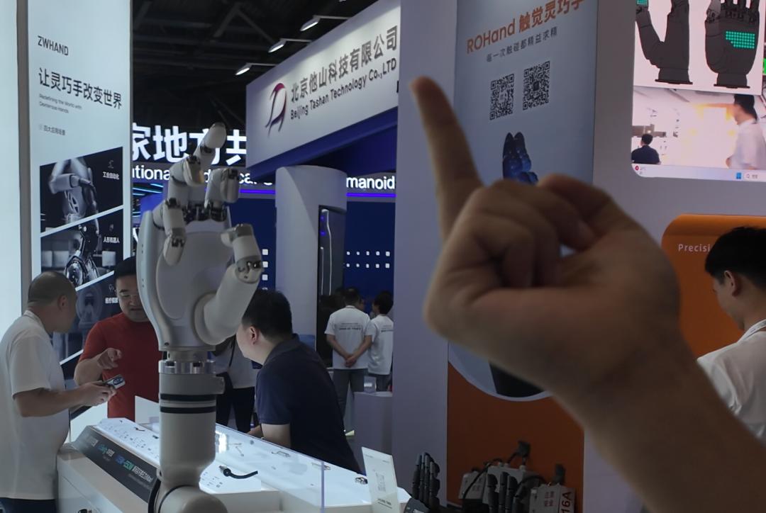 還有靈巧手供應(yīng)商展示產(chǎn)品,有只手能精準(zhǔn)模仿手勢。我們詢問了一下,一只手大概要四五萬,價格有點貴。