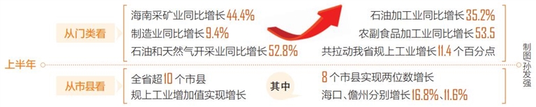 從門類來看,上半年海南采礦業(yè)同比增長44.4%,制造業(yè)同比增長9.4%。在重點行業(yè)中,石油和天然氣開采業(yè)、石油加工業(yè)、農(nóng)副食品加工業(yè)分別同比增長52.8%、35.2%、53.5%,共同拉動全省規(guī)上工業(yè)增長11.4個百分點。