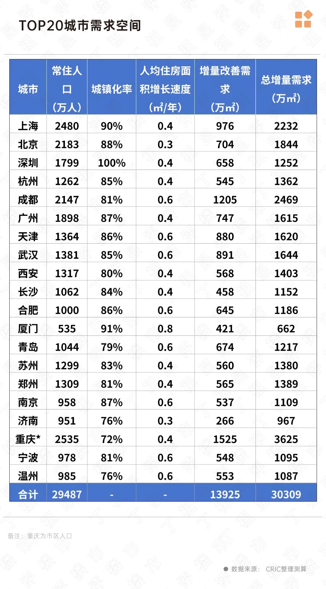 隨著行業(yè)進入深度調(diào)整期,城市間規(guī)模分化更加明顯,行業(yè)投資和成交規(guī)模進一步向頭部城市集中。聚焦TOP20城市,據(jù)CRIC測算,這20城年均增量住房需求仍可達3億平方米,主要是人口持續(xù)集聚和存量住房改善的推動。