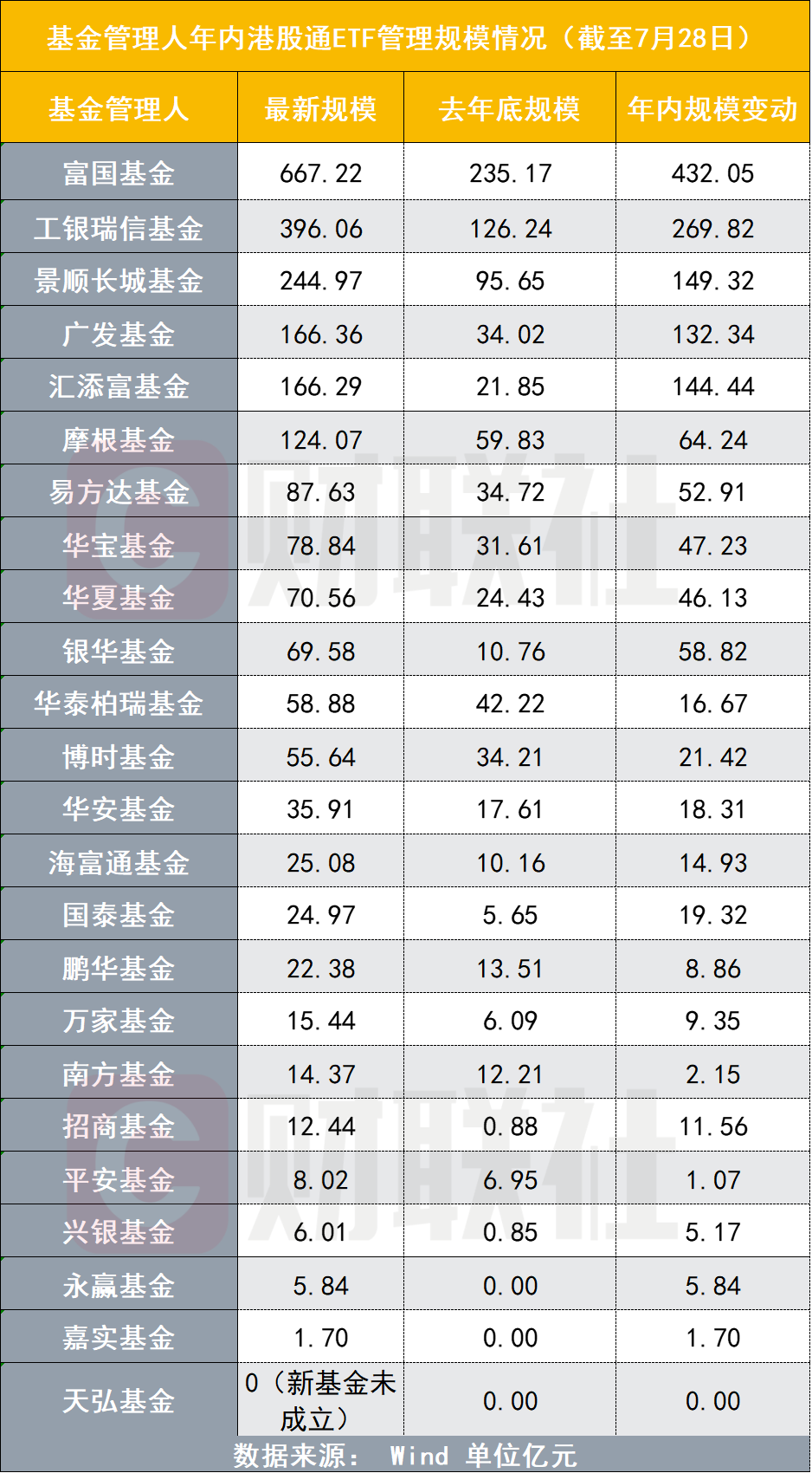 據(jù)Wind數(shù)據(jù)顯示,截至7月28日,78只已成立的港股通主題ETF(統(tǒng)計(jì)口徑:基金全稱(chēng)包含“港股通”)的合計(jì)規(guī)模達(dá)到2358.26億元,相較于去年底的824.61億元,增加了1533.65億元,增幅高達(dá)185.98%。