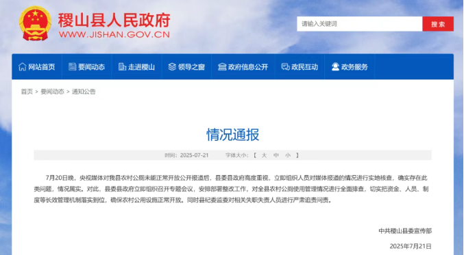 7月21日,山西稷山縣委宣傳部發(fā)布通報(bào),證實(shí)情況屬實(shí)??h委縣政府部署整改,全面排查全縣農(nóng)村公廁使用管理情況,落實(shí)資金、人員、制度等長效管理機(jī)制,確保農(nóng)村公用設(shè)施正常開放。同時(shí),縣紀(jì)委監(jiān)委對(duì)相關(guān)失職失責(zé)人員嚴(yán)肅追責(zé)問責(zé)。