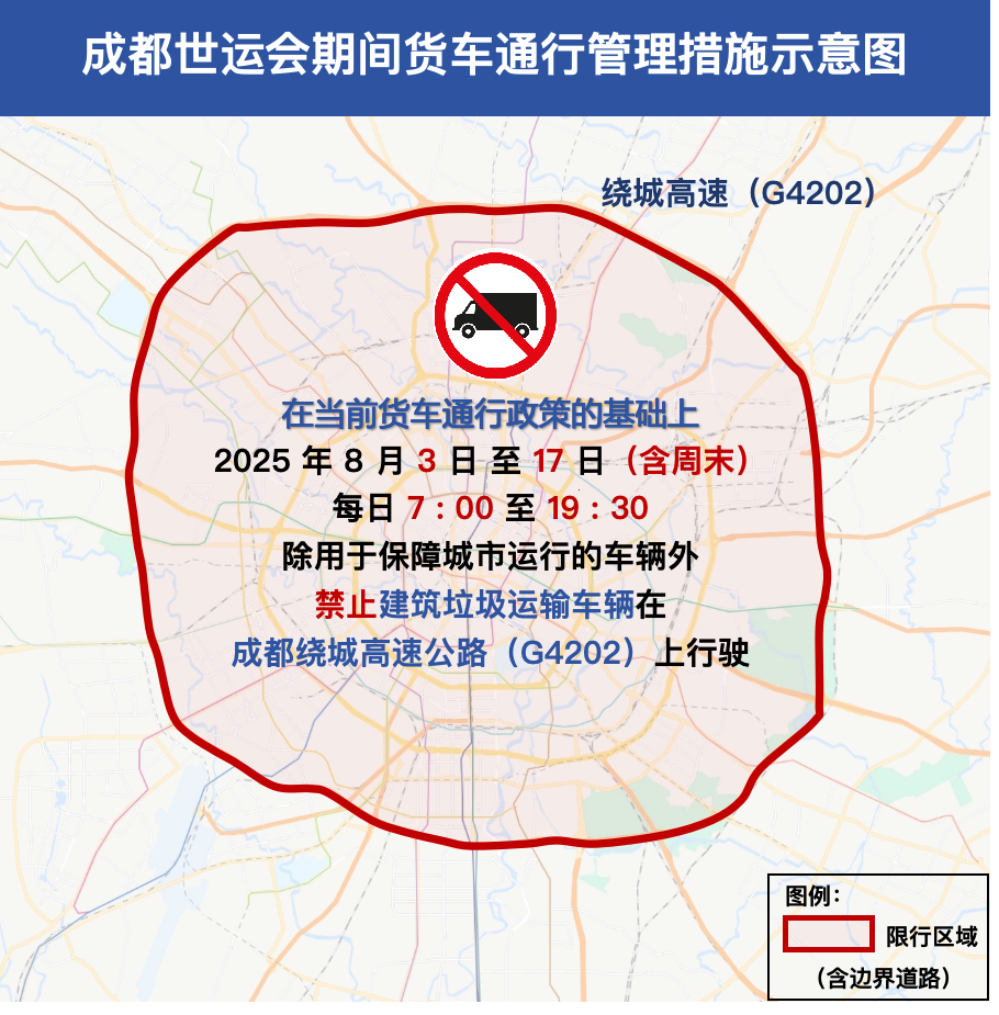 答:僅新增對(duì)建筑垃圾運(yùn)輸車輛的管理,2025年8月3日至8月17日,每日7:00至22:00,限制其在成都繞城高速公路(G4202)通行。其他貨車仍按成都市現(xiàn)行貨車通行管理規(guī)定執(zhí)行。