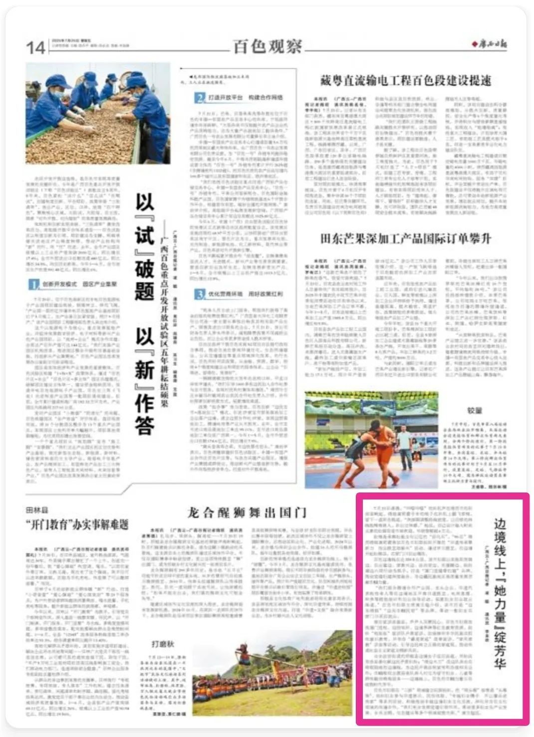 百色邊境線長達(dá)359.5公里,該市婦聯(lián)以思想鑄邊、創(chuàng)業(yè)富邊、家教興邊、法治安邊、關(guān)愛暖邊、組織固邊六項行動為著力點(diǎn),打造“國門黨建帶婦建”品牌,推動黨建與婦建深度融合,為邊疆民族地區(qū)高質(zhì)量發(fā)展貢獻(xiàn)巾幗力量。