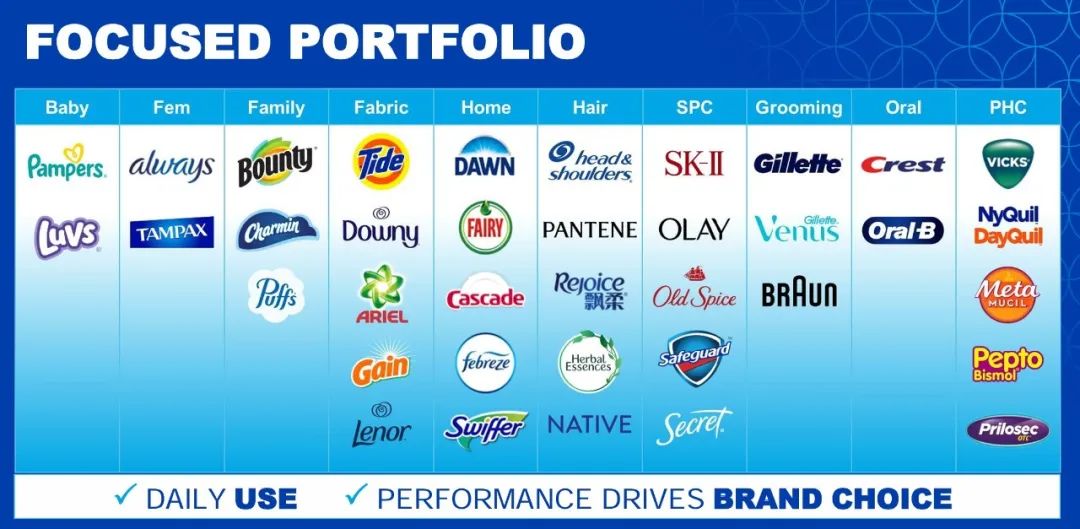 寶潔旗下?lián)碛斜姸嘀放疲w美發(fā)、護(hù)膚、個人護(hù)理、家居清潔、嬰兒護(hù)理等領(lǐng)域,包括海飛絲、潘婷、飄柔、SK-II、玉蘭油、舒膚佳、佳潔士、歐樂-B、吉列、博朗、護(hù)舒寶、幫寶適、汰漬、碧浪等。