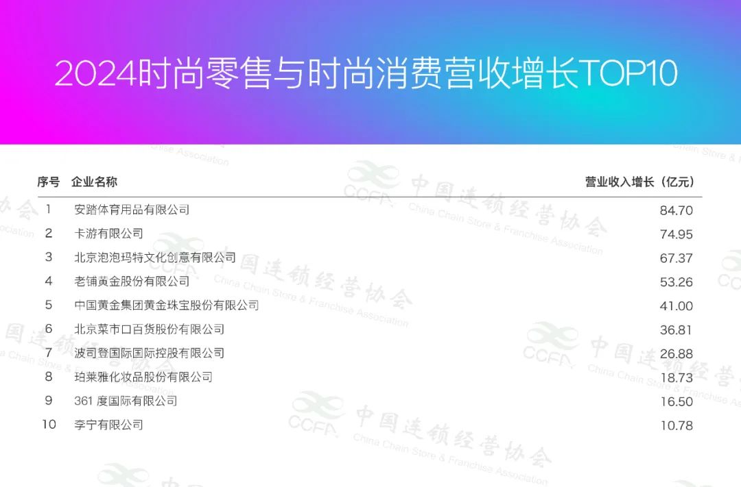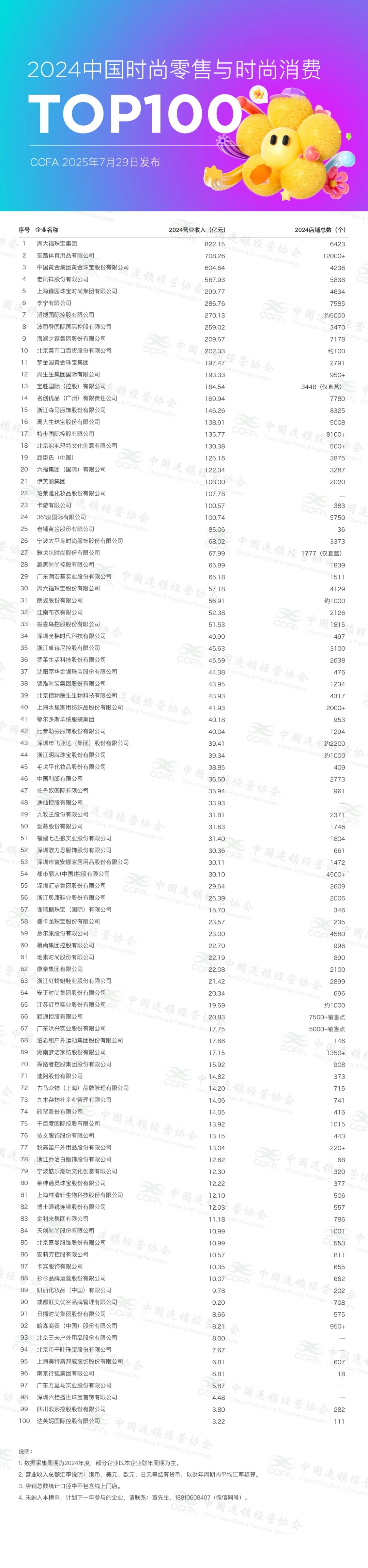 7月29日,依據(jù)2024年企業(yè)經(jīng)營情況調(diào)查結(jié)果以及相關(guān)數(shù)據(jù)統(tǒng)計匯總,中國連鎖經(jīng)營協(xié)會公布了“2024年中國時尚零售與時尚消費(fèi)TOP100”。