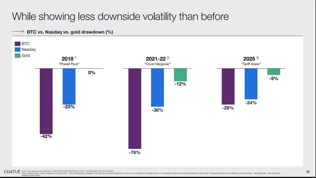 此前「明亮公司」也曾提及Coatue今年EMW大會(huì)上對(duì)比特幣等加密資產(chǎn)的理解。首先,Coatue分析發(fā)現(xiàn),在2025年以來,比特幣的波動(dòng)性下限基本上已經(jīng)接近于納斯達(dá)克水平,但在2018年、2021 - 2022年則遠(yuǎn)低于納斯達(dá)克(下圖)。