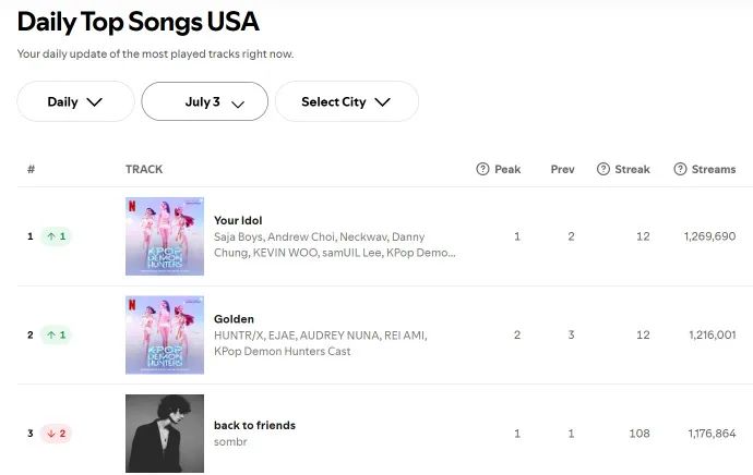 K - POP舞臺本就以觀賞性為賣點(diǎn),得益于動(dòng)畫這一載體,影片畫面更加華麗奪目,與成熟的音樂制作共同帶來了一流的視聽體驗(yàn),也讓觀眾愿意忽略劇本的不足,在IMDb和豆瓣上為《K - POP獵魔女團(tuán)》打出7.8和6.7這樣高于及格線的分?jǐn)?shù)。片中幾首插曲還空降美國公告牌、Spotify、Apple Music等多個(gè)音樂榜單前列,刷新了K - POP有史以來男女團(tuán)的紀(jì)錄。