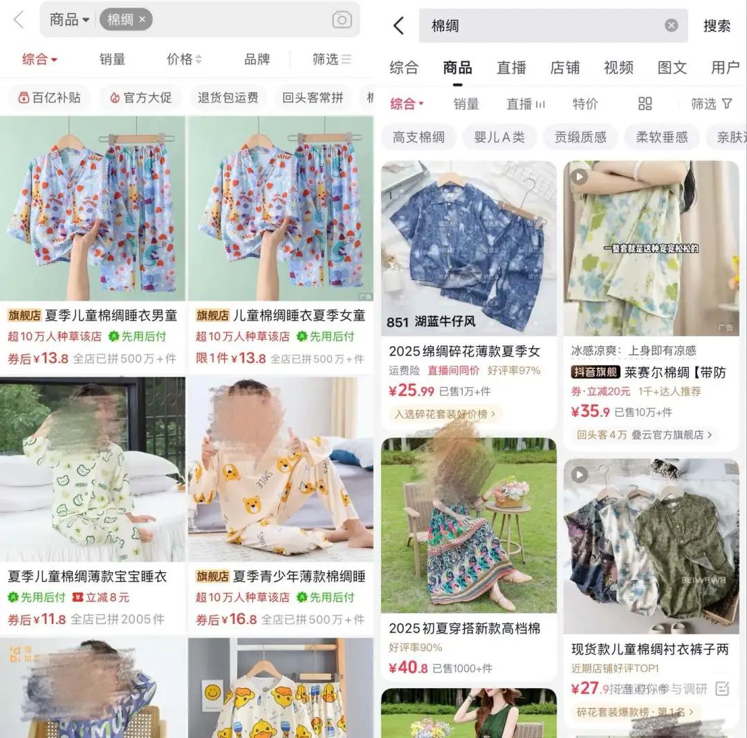 圖:電商平臺上“棉綢”衣服銷量情況來源:拼多多(左)、 抖音(右) 《聽筒Tech》截圖