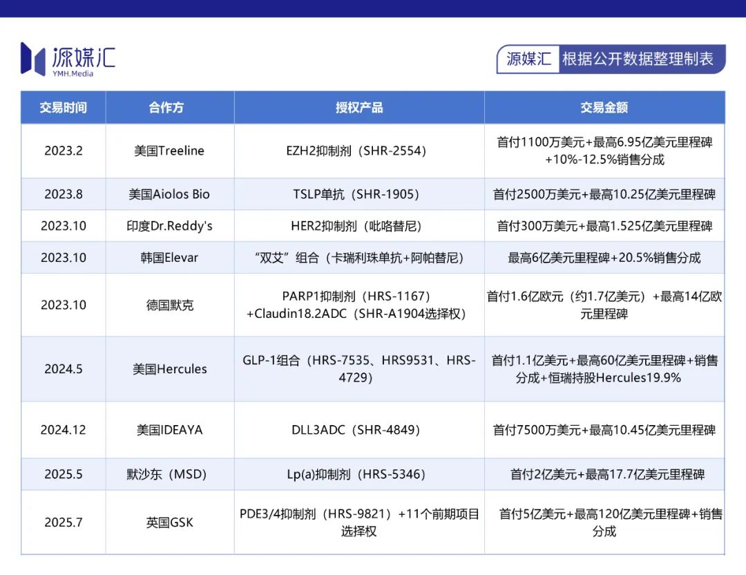 2025年以來,恒瑞醫(yī)藥完成了多款藥物的BD(商務(wù)拓展)交易。交易首付款與潛在總金額呈顯著的階梯式攀升,體現(xiàn)了其管線價值與BD議價能力的持續(xù)提升。