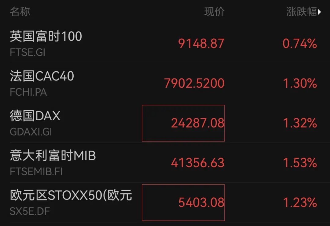 歐洲股市普漲。截至發(fā)稿,英國富時100指數(shù)上漲0.74%,法國CAC40指數(shù)上漲1.3%,德國DAX指數(shù)上漲1.32%,意大利富時MIB指數(shù)上漲1.53%。