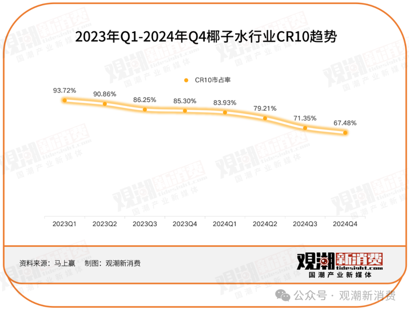 同期,椰子水行業(yè)CR10(前10名市場份額)由93.7%下降至67.5%,市場快速擴張的同時,集中度大幅下降,更多品牌正找準細分優(yōu)勢嶄露頭角。