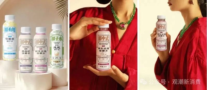 主打“東方鮮椰”的蔻蔻椰先是以爆品鮮萃粉椰水拉開了差異化的序幕,后又于今年連續(xù)推出“椰中式”和“椰有用”兩個產(chǎn)品矩陣,前者將玫瑰、黑枸杞、桑葚等滋補天然食材復(fù)配打出“中式養(yǎng)生”概念,后者則以“NFC椰子水+NFC檸檬汁”的雙NFC配方主攻電解質(zhì)功能飲生態(tài)位,將差異化進行到底。