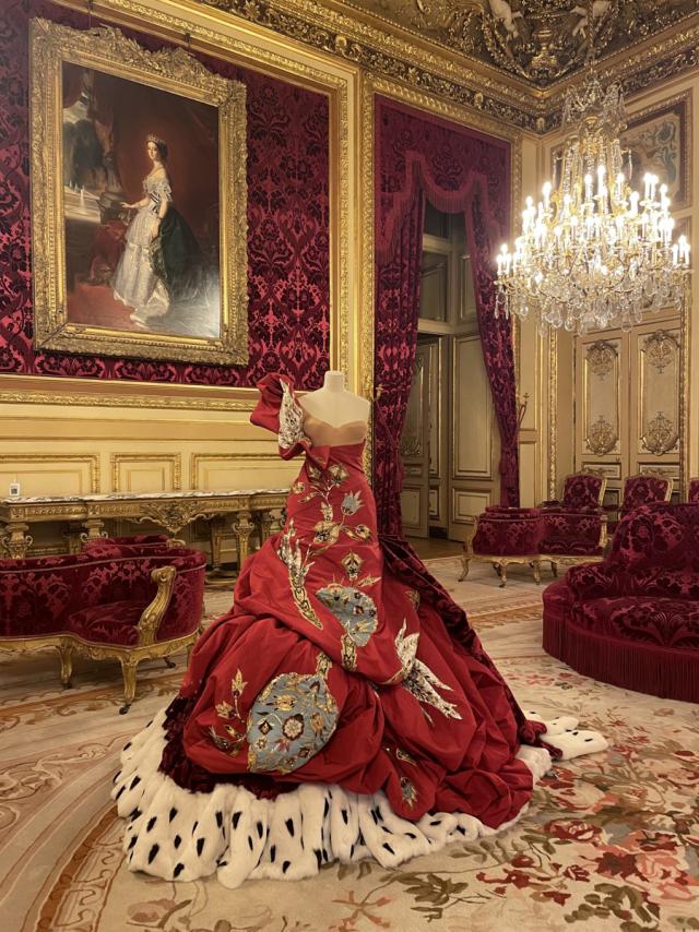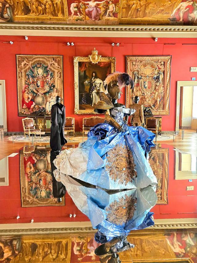過去博物館可能被視為“文化墳?zāi)埂?,而這場(chǎng)展覽讓我們有新想象:博物館是縫紉室、靈感試衣間,提供圖像記憶和思維材料。在拿破侖三世套房中,設(shè)計(jì)作品的夸張剪裁與色彩讓我們想起19世紀(jì)末期權(quán)力欲望與視覺暴力,時(shí)尚不僅“借用”歷史,更對(duì)其評(píng)述、轉(zhuǎn)譯與再編織。