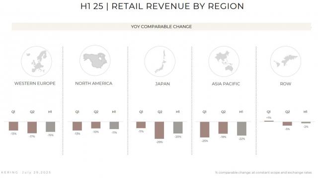 而開云在西歐和日本的同店銷售加速下降,二季度分別下降17%和29%,超過各自地區(qū)一季度同店銷售的降幅13%和11%。
