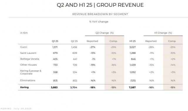 二季度開云的同店銷售下降15%,降幅也超過分析師預(yù)期的14.7%以及一季度的14%。開云稱,二季度營收中有3%受匯率負(fù)面影響。